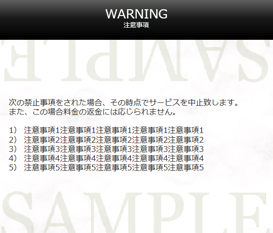注意事項コンテンツは店舗をご利用いただく上での「注意事項、禁止事項、ご利用規約」として